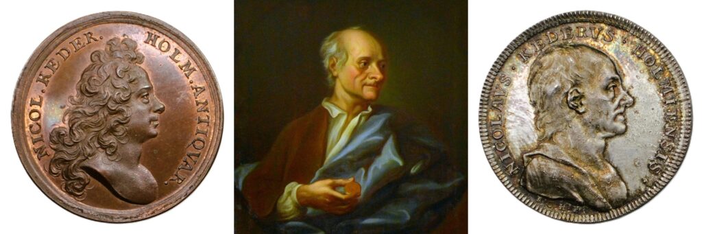Nils KEDER (1659-1735). Berömd numismatiker och fornforskare. Minnesmedalj graverad av ”de svenska medaljkonstens fader”, Arvid Karlsteen år 1697 i samband med att Keder utnämndes till assessor vid Antikvitetsarkivet (Antikvitetskollegium).
