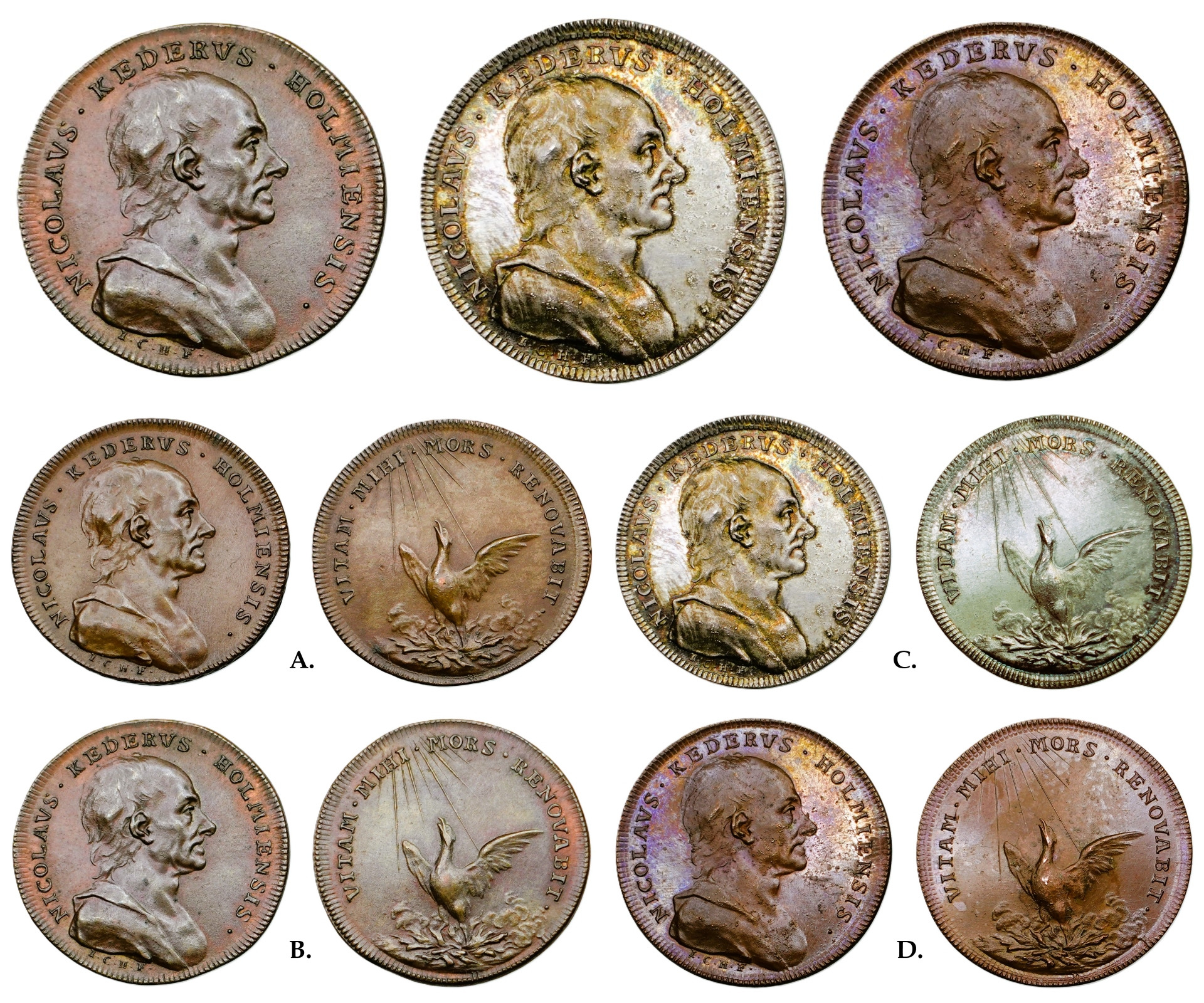 Nils KEDER (1659-1735). Berömd numismatiker och fornforskare. Minnesmedalj graverad av Johan Carl Hedlinger efter Keders bortgång år 1735. På frånsidan ser vi Fågel Fenix, omgiven av den latinska inskriptionen: VITAM MIHI MORS RENOVABIT (”Döden ska ge mig nytt liv”). Litteratur: Hyckert I:157:14. Felder 151. Ovan fyra olika exemplar enligt beskrivning nedan.