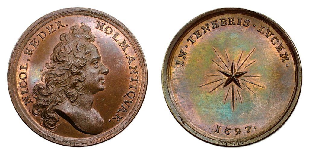 Åtsidan visar Keders högervända bröstbild utan klädnad, införd tidstypisk peruk. Omskriften: NICOL. KEDER. HOLM. ANTIQVAR. (Nils Keder, Stockholm, Antikvarie). Frånsidan en strålande femuddig stjärna. Omskriften lyder: IN TENEBRIS LVCEM (”I mörkret, ljus” eller ”Ljuset i mörkret”), nedtill årtalet 1697. Litteratur: Hyckert I:154:5a.