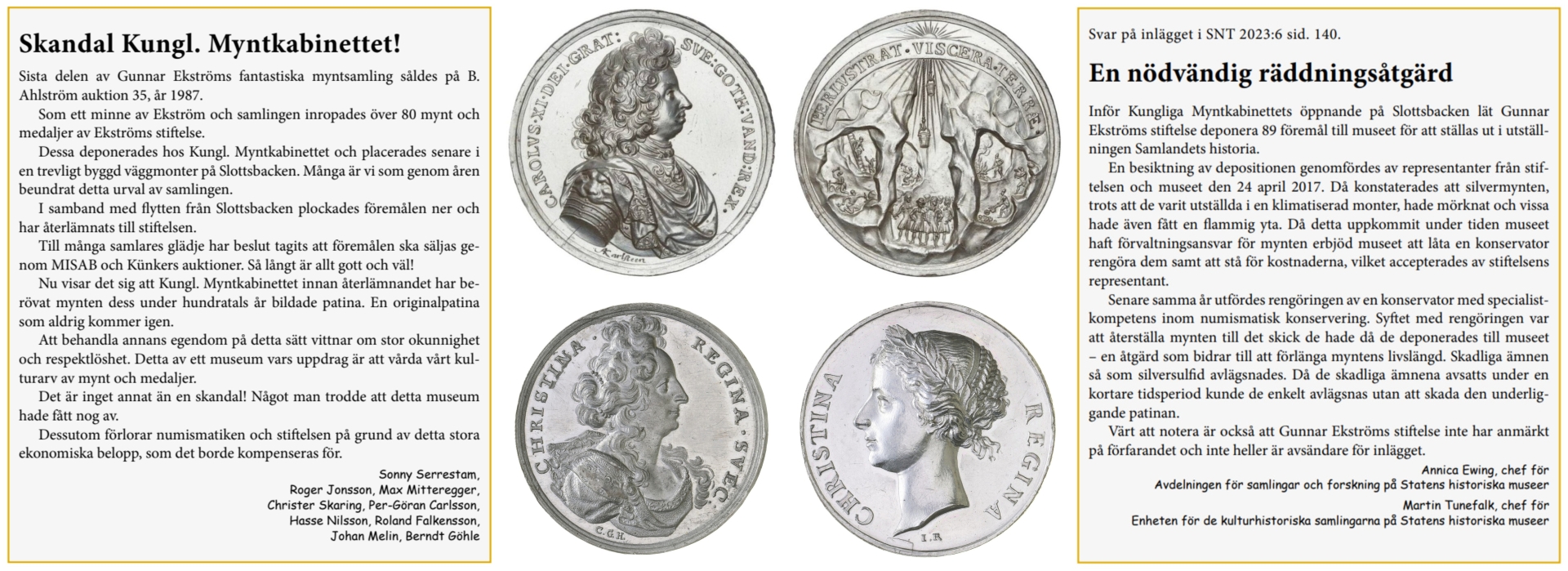 För ett par år sedan blev det stor skandal när det uppdagades att närmare nittio mynt och medaljer ur storsamlaren och donatorn Gunnar Ekströms samling, rengjorts och förstörts av självaste Ekonomiska museet (f.d. Kungliga Myntkabinettet). Några erfarna och upprörda samlare skrev bl.a. så här i SNT 6-2023: – ”Nu visar det sig att Kungl. Myntkabinettet innan återlämnandet har berövat mynten dess under hundratals år bildade patina. En originalpatina som aldrig kommer igen. Att behandla annans egendom på detta sätt vittnar om stor okunnighet och respektlöshet. Detta av ett museum vars uppdrag är att vårda vårt kulturarv av mynt och medaljer. Det är inget annat än en skandal! Något man trodde att detta museum hade fått nog av.”